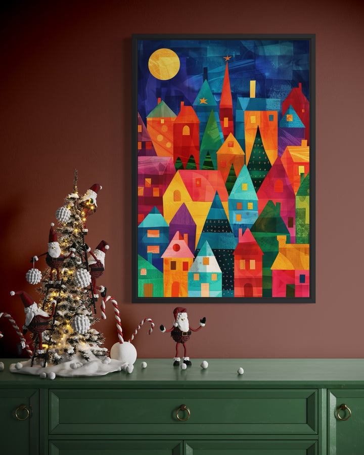 A vibrant interplay of illuminated houses and night sky. The clean geometry and warm points of light lend the scene a fairytale character, full of life and festivity.