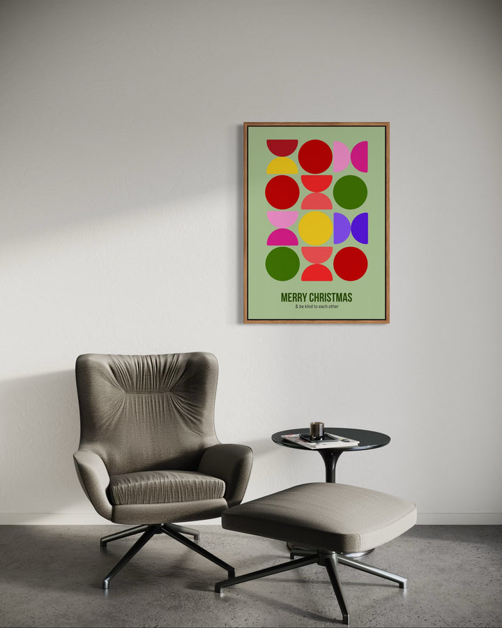 Abstract shapes and vibrant colors bring a modern flair to the holidays. A design somewhere between retro and pop art.