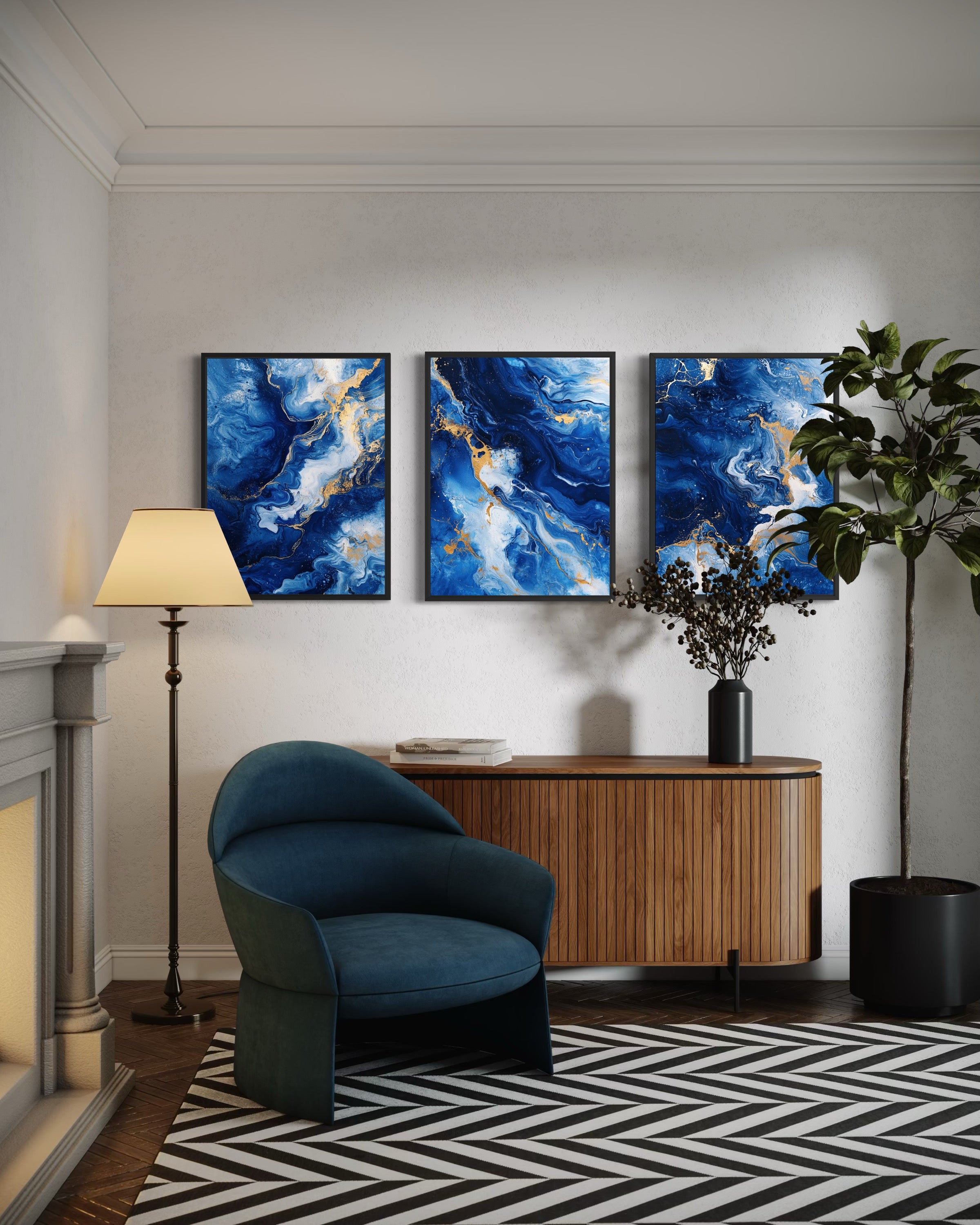 Deep blue flows in marbled gradients, interwoven with delicate gold accents. The surface evokes a turbulent sea. Powerful, elegant, and hypnotic. A statement piece with maritime depth.