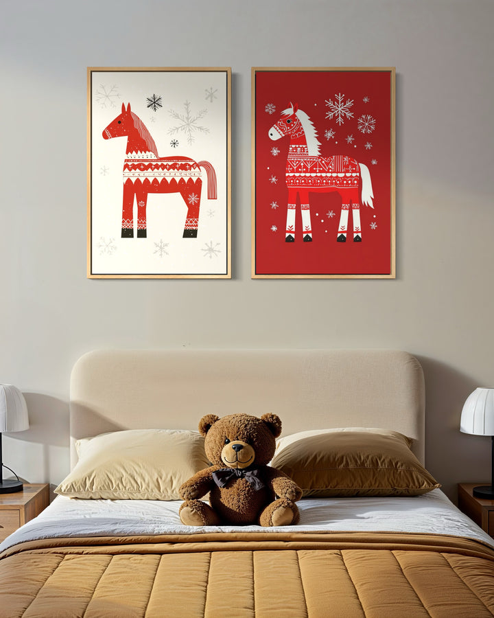 Leuchtend rot auf festlichem Hintergrund. Ein Symbol für Glück und skandinavische Winterkultur. Dala Horse No. 2 bringt nordisches Flair in jedes Zuhause.