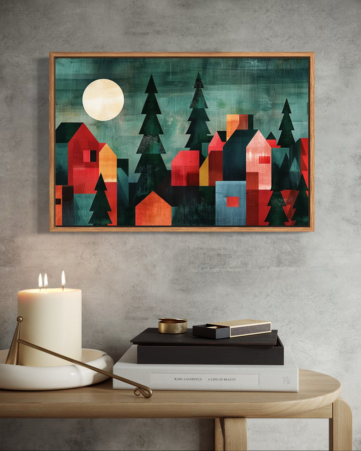 Ein harmonisches Winterdorf in skandinavisch inspirierter Farbwelt. Die Kombination aus klaren Formen und atmosphärischem Mondlicht schafft eine ruhige, moderne Weihnachtsstimmung voller Tiefe.