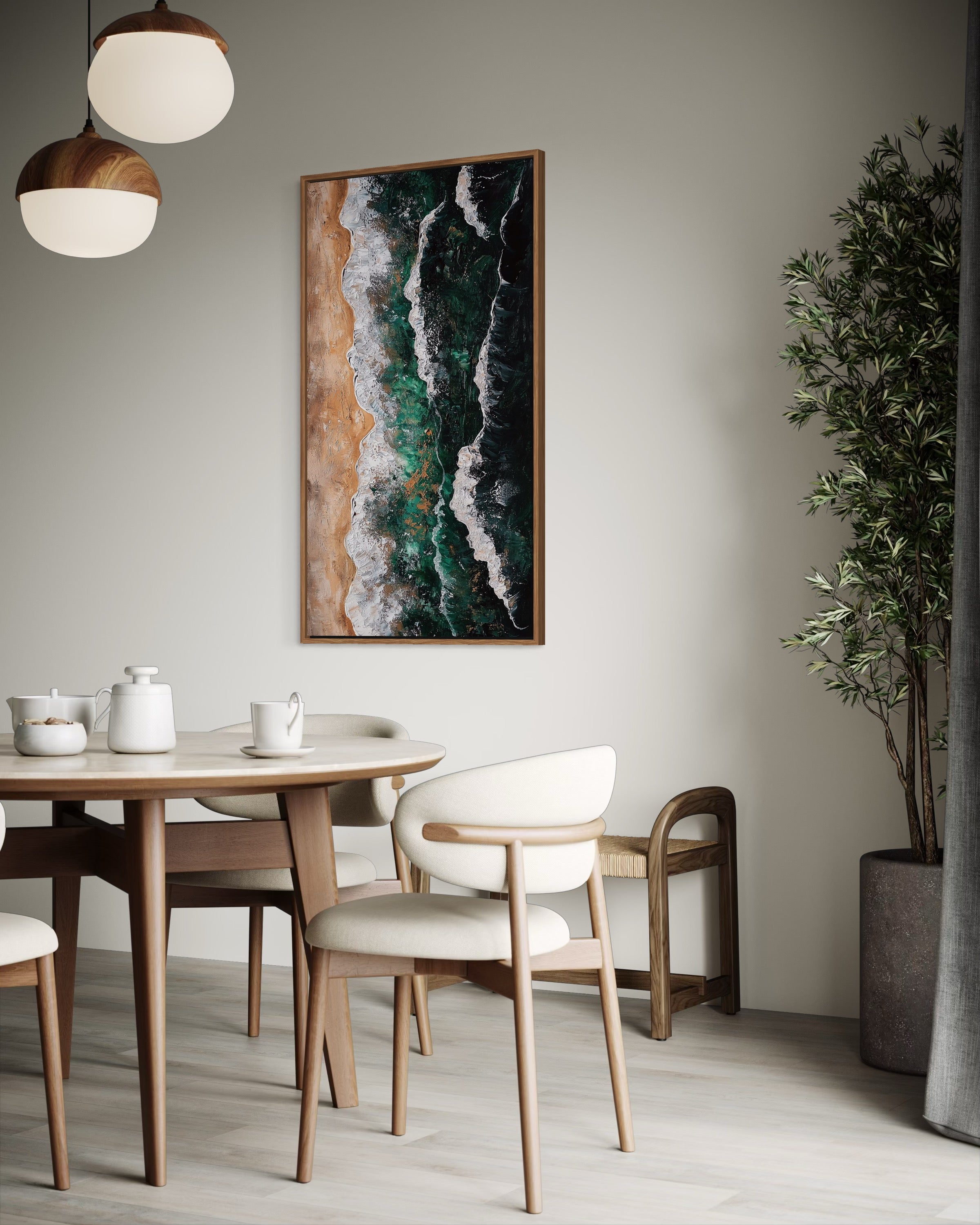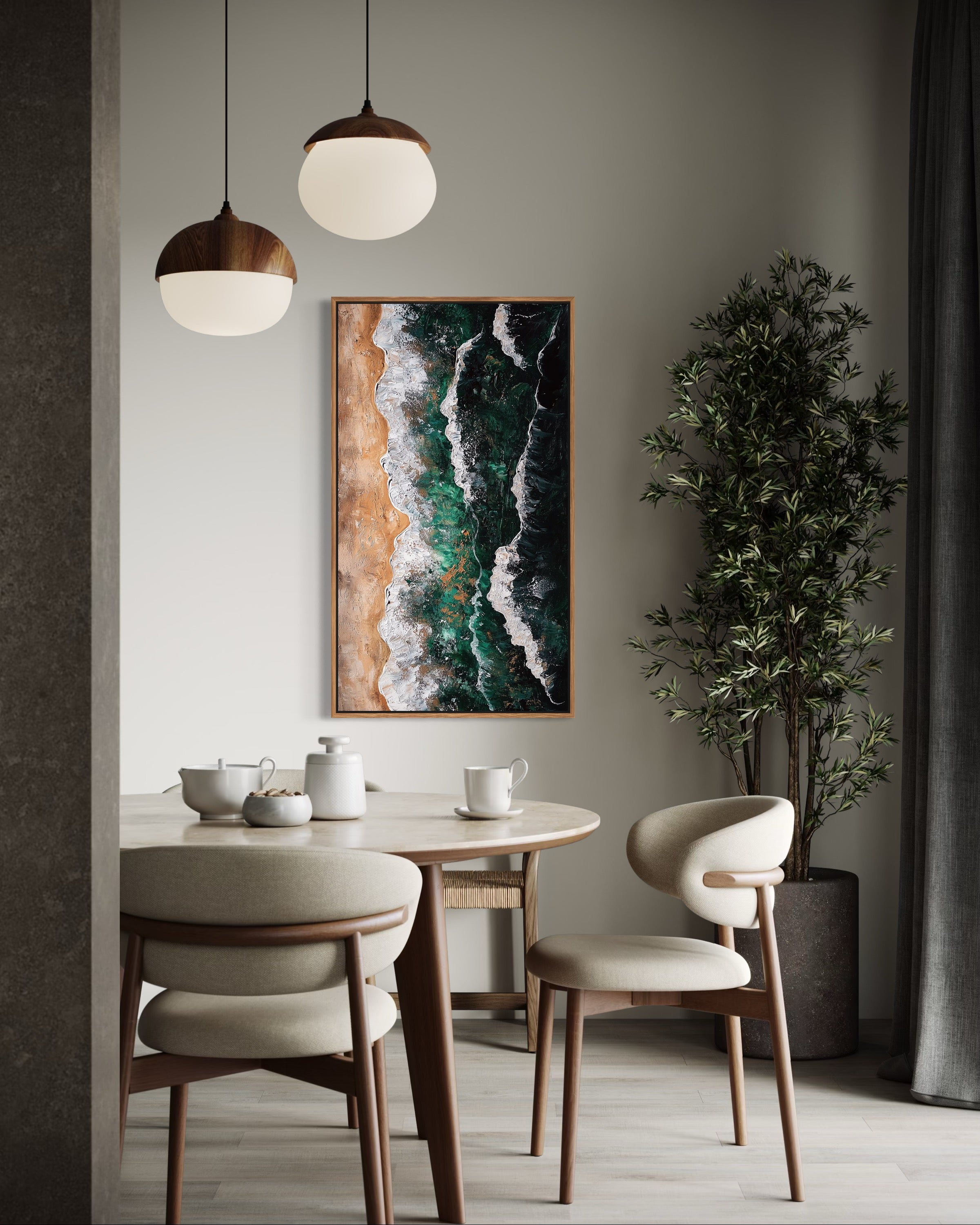 Feine Linien und aquatische Texturen spiegeln das Zusammenspiel von Land und Meer. Die Wellenbewegung wirkt beruhigend und kraftvoll zugleich. Ein Symbol für Rhythmus und Natur.