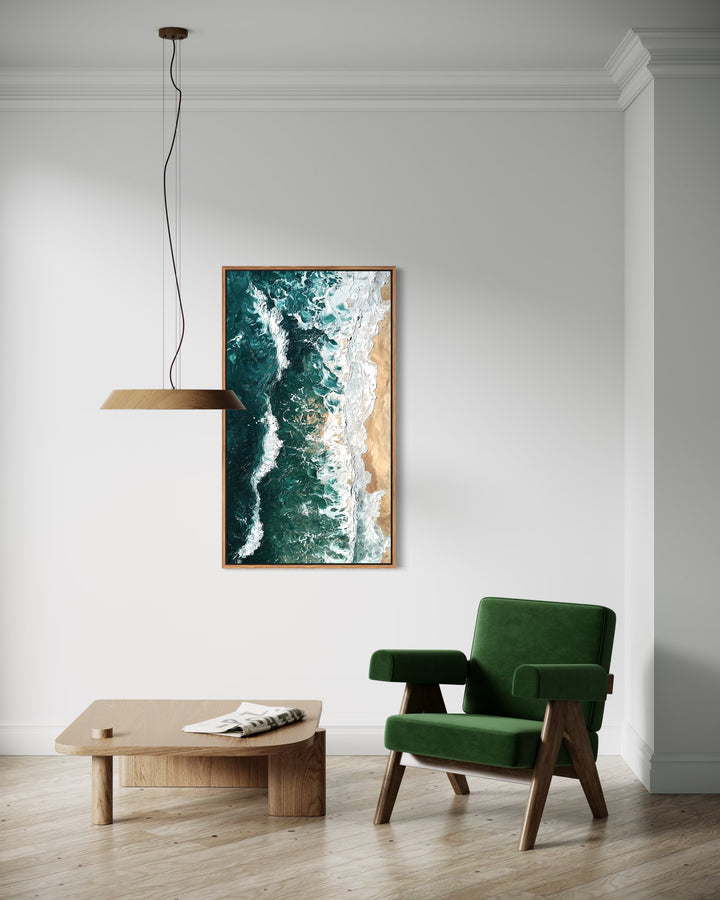 Das Meer in Bewegung. Wellen brechen sanft auf den Strand, während Licht und Schatten ineinander übergehen. Ein Werk von stiller Energie und fließender Eleganz.