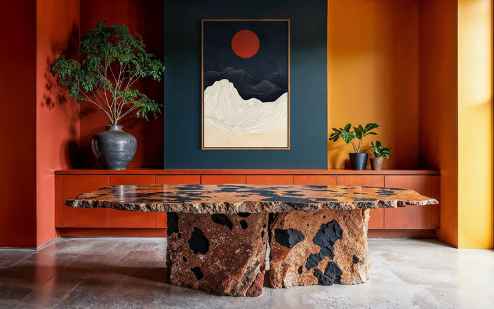 Feine Linien formen weiche Berg- und Wellenstrukturen vor dunklem Hintergrund. Die Komposition steht für das Gleichgewicht zwischen Bewegung und Ruhe.